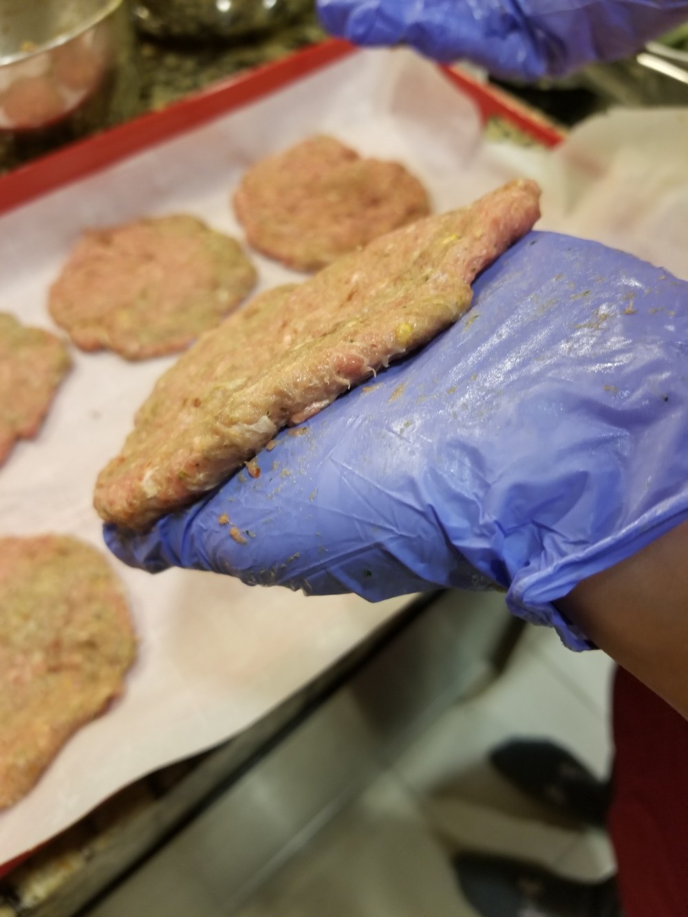 6. Mold the meat mix in your palms round, flat, and quite thin. (See image at the end of the post)